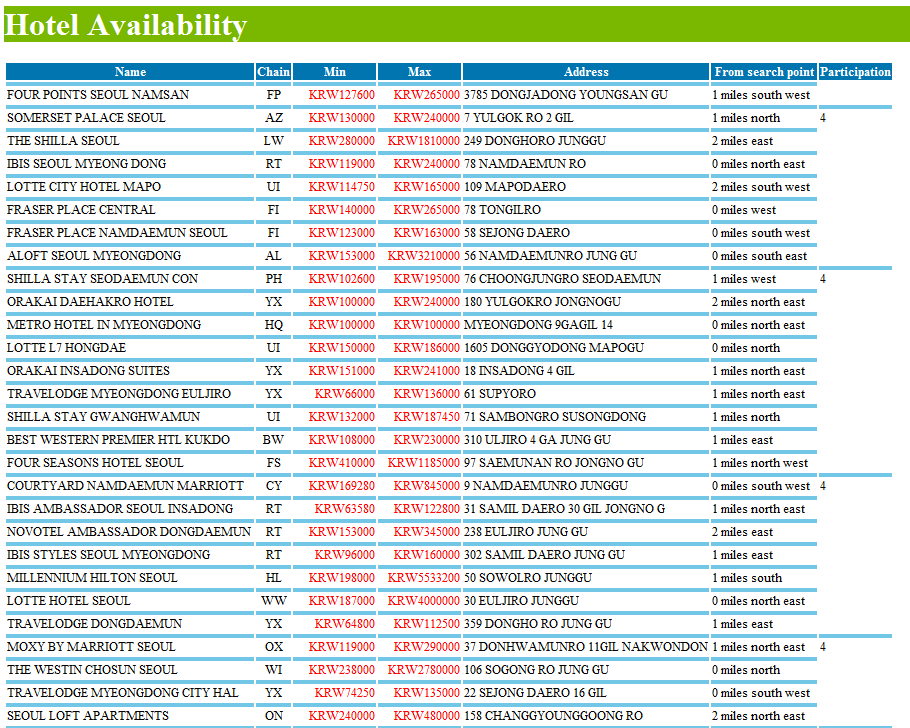 <!--?xml:stylesheet type="text/xsl" href="HotelSearchAvailabilityRsp.xslt"?--> <SOAP:Envelope xmlns:SOAP="http://schemas.xmlsoap.org/soap/envelope/"> <SOAP:Body> <hotel:HotelSearchAvailabilityRsp TraceId="20200318141422" TransactionId="EC891E6C0A0E562B78EFF66AEA977407" ResponseTime="4286" xmlns:hotel="http://www.travelport.com/schema/hotel_v50_0" xmlns:common_v50_0="http://www.travelport.com/schema/common_v50_0"> <hotel:ReferencePoint Country="KR">SEOUL</hotel:ReferencePoint> <hotel:HotelSearchResult> <common_v50_0:VendorLocation ProviderCode="1P" VendorCode="FP" VendorLocationID="4245" Key="qWnEYDrYlDKA82CM4HAAAA=="/> <hotel:HotelProperty HotelChain="FP" HotelCode="4245" Name="FOUR POINTS SEOUL NAMSAN" VendorLocationKey="qWnEYDrYlDKA82CM4HAAAA==" Availability="Available"> <hotel:PropertyAddress> <hotel:Address>3785 DONGJADONG YOUNGSAN GU</hotel:Address> <hotel:Address>SEOUL 04323</hotel:Address> </hotel:PropertyAddress> <common_v50_0:PhoneNumber Type="Fax" Number="82 2 60707999"/> <common_v50_0:PhoneNumber Type="Business" Number="82 2 60707000"/> <common_v50_0:Distance Units="MI" Value="1" Direction="SW"/> </hotel:HotelProperty> <hotel:RateInfo ApproximateMinimumAmount="KRW127600" ApproximateMaximumAmount="KRW265000"/> <hotel:HotelType SourceLink="true"/> </hotel:HotelSearchResult> <hotel:HotelSearchResult> <common_v50_0:VendorLocation ProviderCode="1P" VendorCode="AZ" VendorLocationID="12123" Key="qWnEYDrYlDKA92CM4HAAAA=="/> <hotel:HotelProperty HotelChain="AZ" HotelCode="12123" Name="SOMERSET PALACE SEOUL" VendorLocationKey="qWnEYDrYlDKA92CM4HAAAA==" ParticipationLevel="4" Availability="Available"> <hotel:PropertyAddress> <hotel:Address>7 YULGOK RO 2 GIL</hotel:Address> <hotel:Address>SEOUL 03143</hotel:Address> </hotel:PropertyAddress> <common_v50_0:PhoneNumber Type="Fax" Number="82-2-67308001"/> <common_v50_0:PhoneNumber Type="Business" Number="82-2-67308888"/> <common_v50_0:Distance Units="MI" Value="1" Direction="N"/> </hotel:HotelProperty> <hotel:RateInfo ApproximateMinimumAmount="KRW130000" ApproximateMaximumAmount="KRW240000"/> <hotel:HotelType SourceLink="true"/> </hotel:HotelSearchResult> <hotel:HotelSearchResult> <common_v50_0:VendorLocation ProviderCode="1P" VendorCode="LW" VendorLocationID="1808" Key="qWnEYDrYlDKA/2CM4HAAAA=="/> <hotel:HotelProperty HotelChain="LW" HotelCode="1808" Name="THE SHILLA SEOUL" VendorLocationKey="qWnEYDrYlDKA/2CM4HAAAA==" Availability="Available"> <hotel:PropertyAddress> <hotel:Address>249 DONGHORO JUNGGU</hotel:Address> <hotel:Address>SEOUL 04605</hotel:Address> </hotel:PropertyAddress> <common_v50_0:PhoneNumber Type="Fax" Number="82-2-22335073"/> <common_v50_0:PhoneNumber Type="Business" Number="82-2-22333131"/> <common_v50_0:Distance Units="MI" Value="2" Direction="E"/> </hotel:HotelProperty> <hotel:RateInfo ApproximateMinimumAmount="KRW280000" ApproximateMaximumAmount="KRW1810000"/> <hotel:HotelType SourceLink="true"/> </hotel:HotelSearchResult> <hotel:HotelSearchResult> <common_v50_0:VendorLocation ProviderCode="1P" VendorCode="RT" VendorLocationID="MYSEL" Key="qWnEYDrYlDKAA3CM4HAAAA=="/> <hotel:HotelProperty HotelChain="RT" HotelCode="MYSEL" Name="IBIS SEOUL MYEONG DONG" VendorLocationKey="qWnEYDrYlDKAA3CM4HAAAA==" Availability="Available"> <hotel:PropertyAddress> <hotel:Address>78 NAMDAEMUN RO</hotel:Address> <hotel:Address>SEOUL KR 04534</hotel:Address> </hotel:PropertyAddress> <common_v50_0:PhoneNumber Type="Fax" Number="82263618050"/> <common_v50_0:PhoneNumber Type="Business" Number="82263618888"/> <common_v50_0:Distance Units="MI" Value="0" Direction="NE"/> </hotel:HotelProperty> <hotel:RateInfo ApproximateMinimumAmount="KRW119000" ApproximateMaximumAmount="KRW240000"/> <hotel:HotelType SourceLink="true"/> </hotel:HotelSearchResult> <hotel:HotelSearchResult> <common_v50_0:VendorLocation ProviderCode="1P" VendorCode="UI" VendorLocationID="55212" Key="qWnEYDrYlDKAB3CM4HAAAA=="/> <hotel:HotelProperty HotelChain="UI" HotelCode="55212" Name="LOTTE CITY HOTEL MAPO" VendorLocationKey="qWnEYDrYlDKAB3CM4HAAAA==" Availability="Available"> <hotel:PropertyAddress> <hotel:Address>109 MAPODAERO</hotel:Address> <hotel:Address>SEOUL 121805</hotel:Address> </hotel:PropertyAddress> <common_v50_0:PhoneNumber Type="Fax" Number="82-260-091004"/> <common_v50_0:PhoneNumber Type="Business" Number="82-260-091000"/> <common_v50_0:Distance Units="MI" Value="2" Direction="SW"/> </hotel:HotelProperty> <hotel:RateInfo ApproximateMinimumAmount="KRW114750" ApproximateMaximumAmount="KRW165000"/> <hotel:HotelType SourceLink="true"/> </hotel:HotelSearchResult> <hotel:HotelSearchResult> <common_v50_0:VendorLocation ProviderCode="1P" VendorCode="FI" VendorLocationID="11778" Key="qWnEYDrYlDKAC3CM4HAAAA=="/> <hotel:HotelProperty HotelChain="FI" HotelCode="11778" Name="FRASER PLACE CENTRAL" VendorLocationKey="qWnEYDrYlDKAC3CM4HAAAA==" Availability="Available"> <hotel:PropertyAddress> <hotel:Address>78 TONGILRO</hotel:Address> <hotel:Address>SEOUL 04517</hotel:Address> </hotel:PropertyAddress> <common_v50_0:PhoneNumber Type="Fax" Number="82-2-22208208"/> <common_v50_0:PhoneNumber Type="Business" Number="82-2-22208000"/> <common_v50_0:Distance Units="MI" Value="0" Direction="W"/> </hotel:HotelProperty> <hotel:RateInfo ApproximateMinimumAmount="KRW140000" ApproximateMaximumAmount="KRW265000"/> <hotel:HotelType SourceLink="true"/> </hotel:HotelSearchResult> <hotel:HotelSearchResult> <common_v50_0:VendorLocation ProviderCode="1P" VendorCode="FI" VendorLocationID="ICNFP" Key="qWnEYDrYlDKAD3CM4HAAAA=="/> <hotel:HotelProperty HotelChain="FI" HotelCode="ICNFP" Name="FRASER PLACE NAMDAEMUN SEOUL" VendorLocationKey="qWnEYDrYlDKAD3CM4HAAAA==" Availability="Available"> <hotel:PropertyAddress> <hotel:Address>58 SEJONG DAERO</hotel:Address> <hotel:Address>SEOUL 04526</hotel:Address> </hotel:PropertyAddress> <common_v50_0:PhoneNumber Type="Fax" Number="82-2-22208340"/> <common_v50_0:PhoneNumber Type="Business" Number="82-2-20980800"/> <common_v50_0:Distance Units="MI" Value="0" Direction="